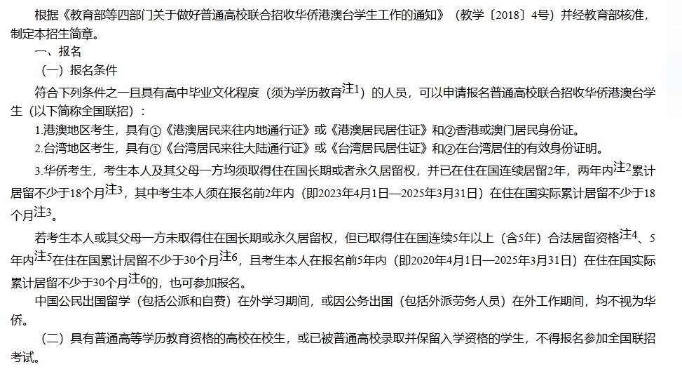 华侨考生:考生及父母一方需在国外定居(持永久居留证),且考生报名前2年在国外实际居住满18个月(连续)。