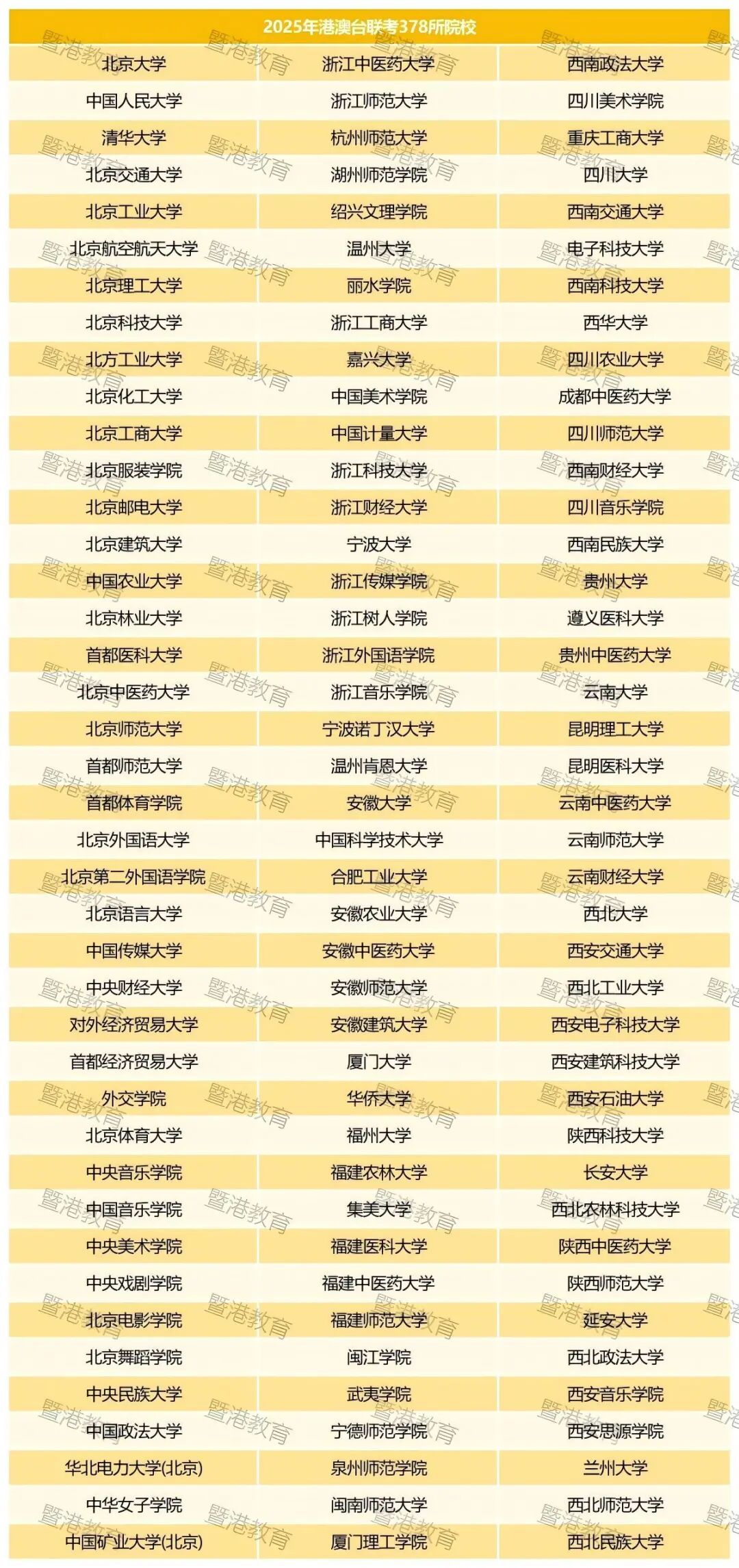 2025年港澳台联考招生院校阵容强大,涵盖了国内绝大多数顶尖学府和特色院校。