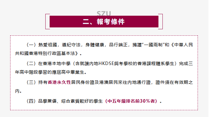 深圳大学面向香港学生实行单独招生政策。报考者需热爱祖国,遵纪守法,身体健康,品行端正,拥护"一国两制"和《中华人民共和国香港特别行政区基本法》。