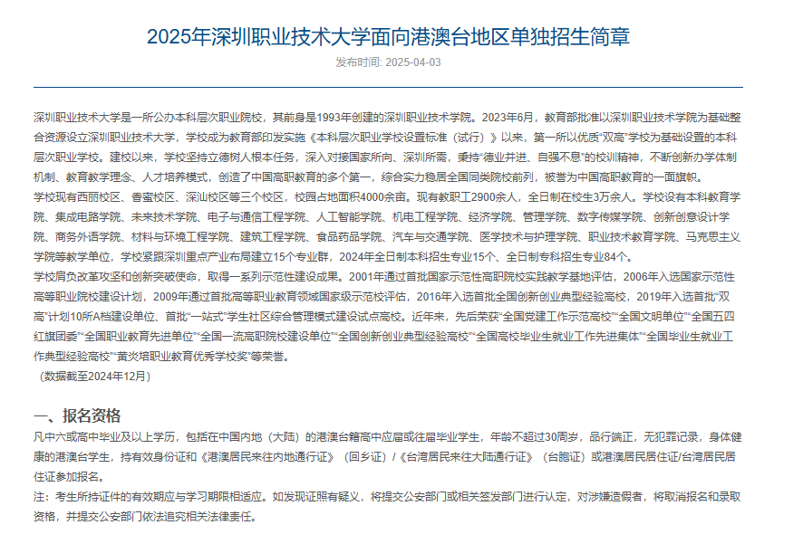作为中国顶尖的职业院校,已升格为职业本科大学,致力于培养高水平高素质技术技能人才。该校面向港澳台地区设有单独的招生渠道,提供与深圳支柱产业紧密相关的特色专业。