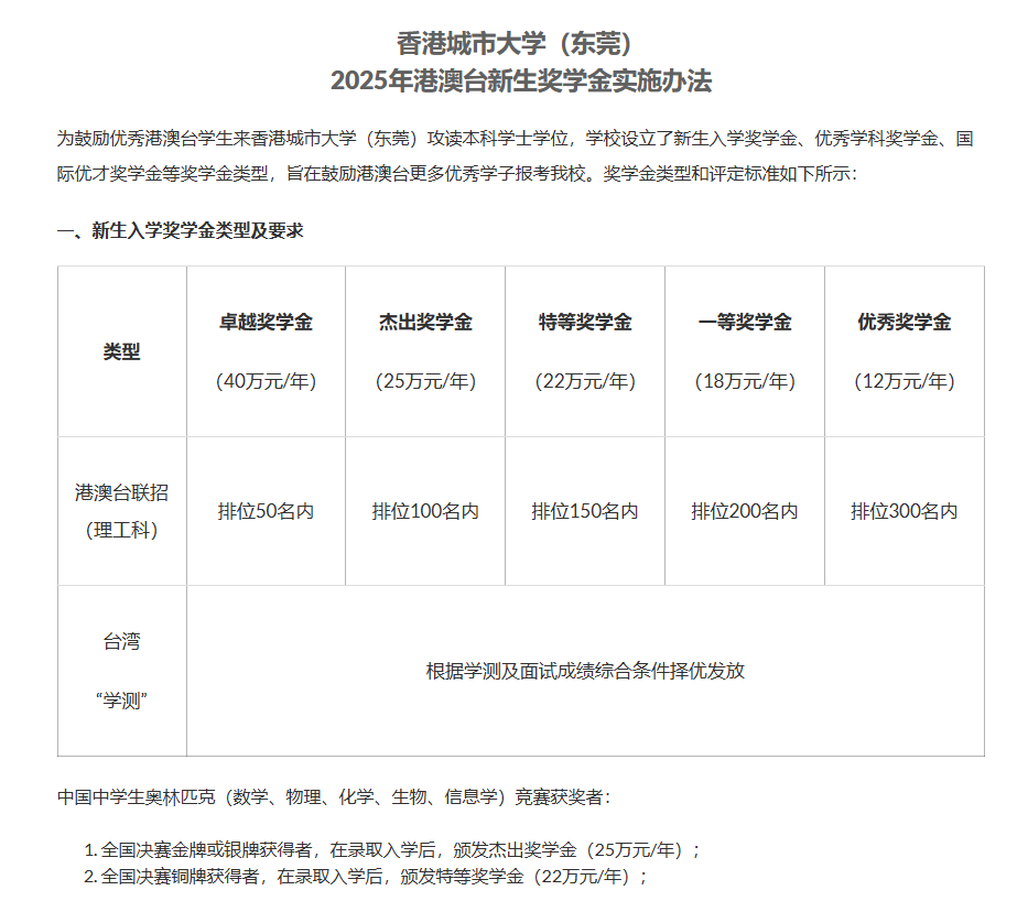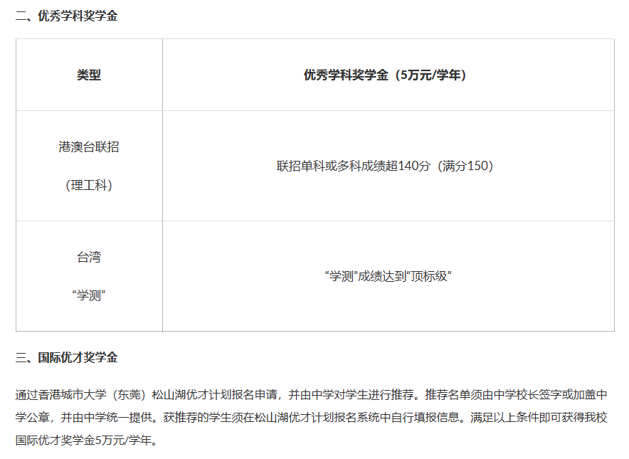 除了上述奖学金,不少高校还设有专项奖学金,如香港城市大学(东莞)为港澳台联招理工科排位前300名的学生提供金额不等的优秀奖学金。高校专项奖学金种类繁多,金额丰厚。