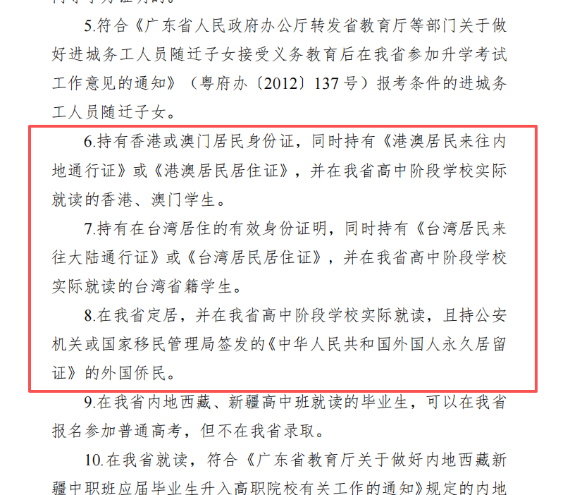 普通高考有实际就读要求:港澳台学生要在广东报名普通高考,不仅需要持有有效的身份证件和通行证或居住证,还要求在广东省高中阶段学校实际就读。如果不在内地中学就读,可能无法满足普通高考报名条件。