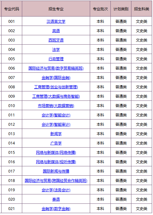 文史类:包括工商管理、金融学、新闻学、法学等21个专业方向。其中工商管理是国家级一流本科专业建设点,与全美创业管理排名第一的百森商学院合作开设部分课程。