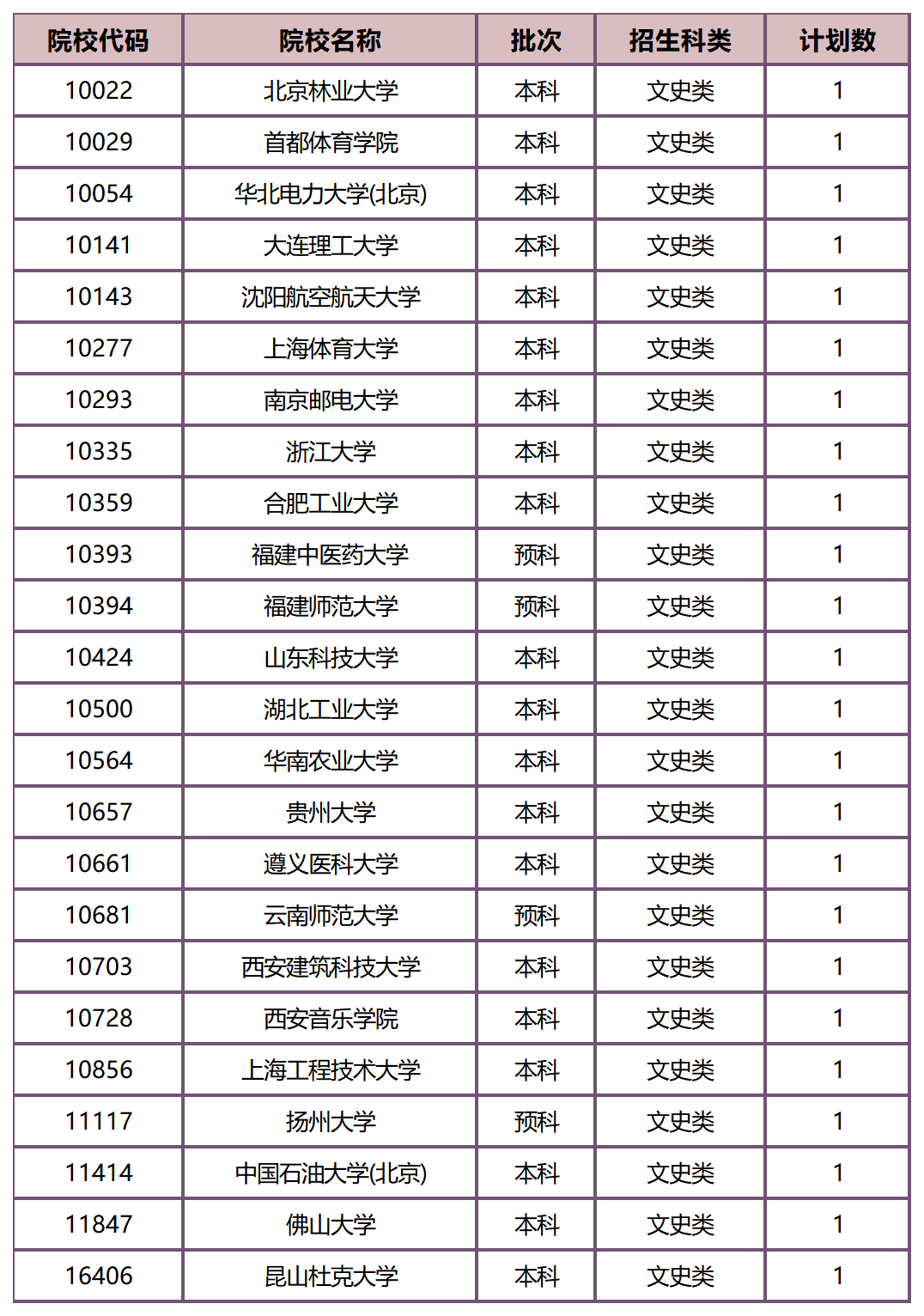 以下是仅招收1名文科生的院校清单: