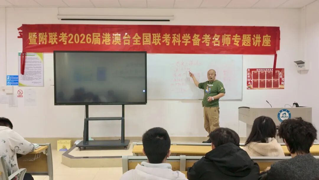 暨附教育港澳台联考学校2026届联考名师专题讲座自1月12日启动以来,已有地理、历史、数学、物理、化学五大学科精彩开讲!活动现场座无虚席,师生互动热烈。今天上午,语文学科讲座为本次活动再添高潮,而1月21日的英语学科讲座将压轴登场。