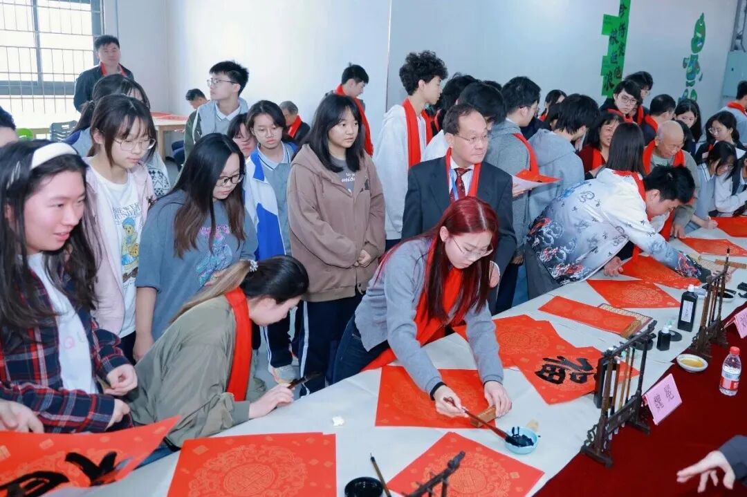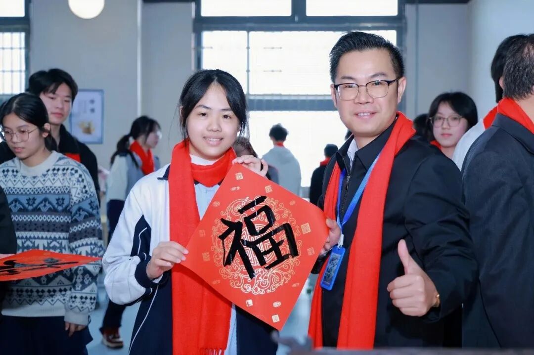 书法名家现场挥毫泼墨,为师生书写春联和“福”字。400余副作品传递着新春的祝福,暨南大学艺术学院教授还为学生带来了一堂生动的艺术普及课,让学生感受到中华传统文化的魅力。